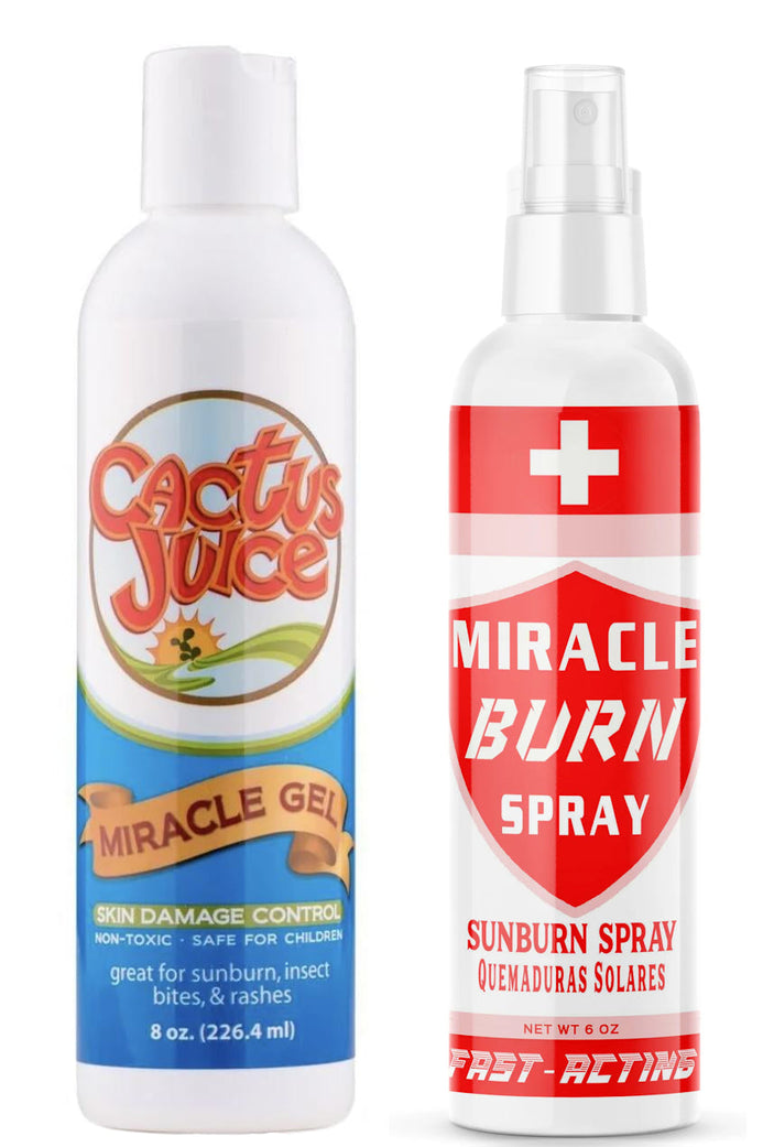 Ouch! Caught a little too much sun? Don’t let a sunburn ruin your vibe. Our Cactus Juice™ Sunburn Special is your ultimate rescue duo, combining the power of our Miracle Burn Spray and Miracle Gel to cool, soothe, and heal your skin in record time. This dynamic duo is your go-to for turning red-hot skin into refreshed, happy skin. Whether it’s a beach day blunder or a backyard BBQ oops, we’ve got you covered—literally!